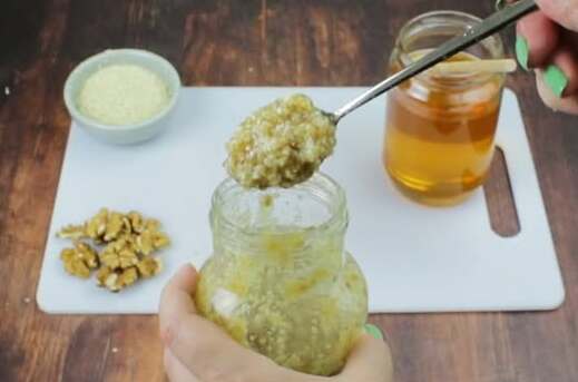 Orahe samleti sitno pa pomešati sa lanenim semenom i susamom. Dodati med i limunov sok, pa sve sjediniti u ujednačenu smesu. Po želji dodati malo rendane kore limuna da smesa dobije svež miris i puniji ukus.